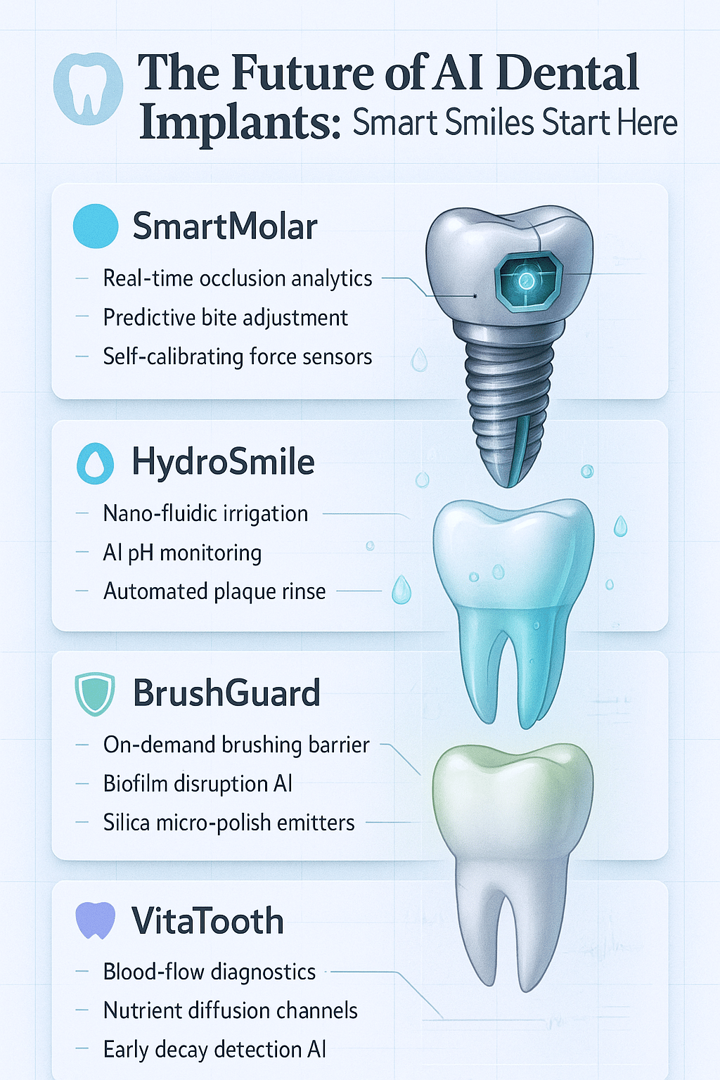 Picture AI-powered dental implants transforming oral care by 2030 with screening, brush reminders, and hydration tracking. Pick your favorite!